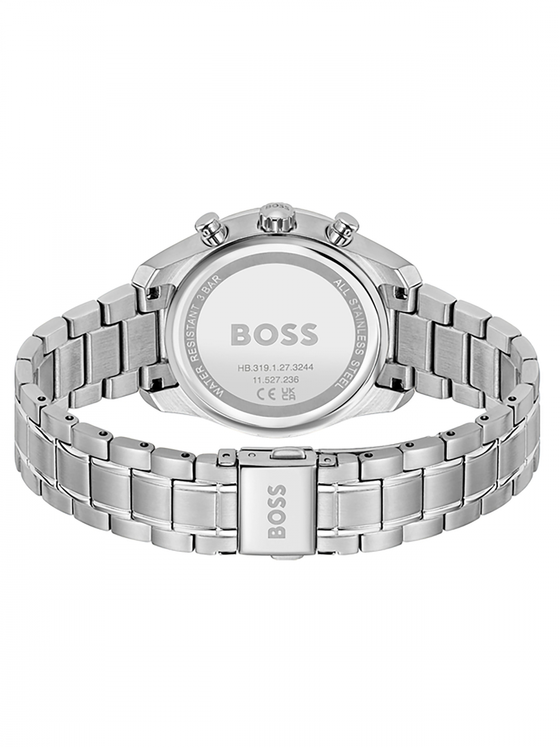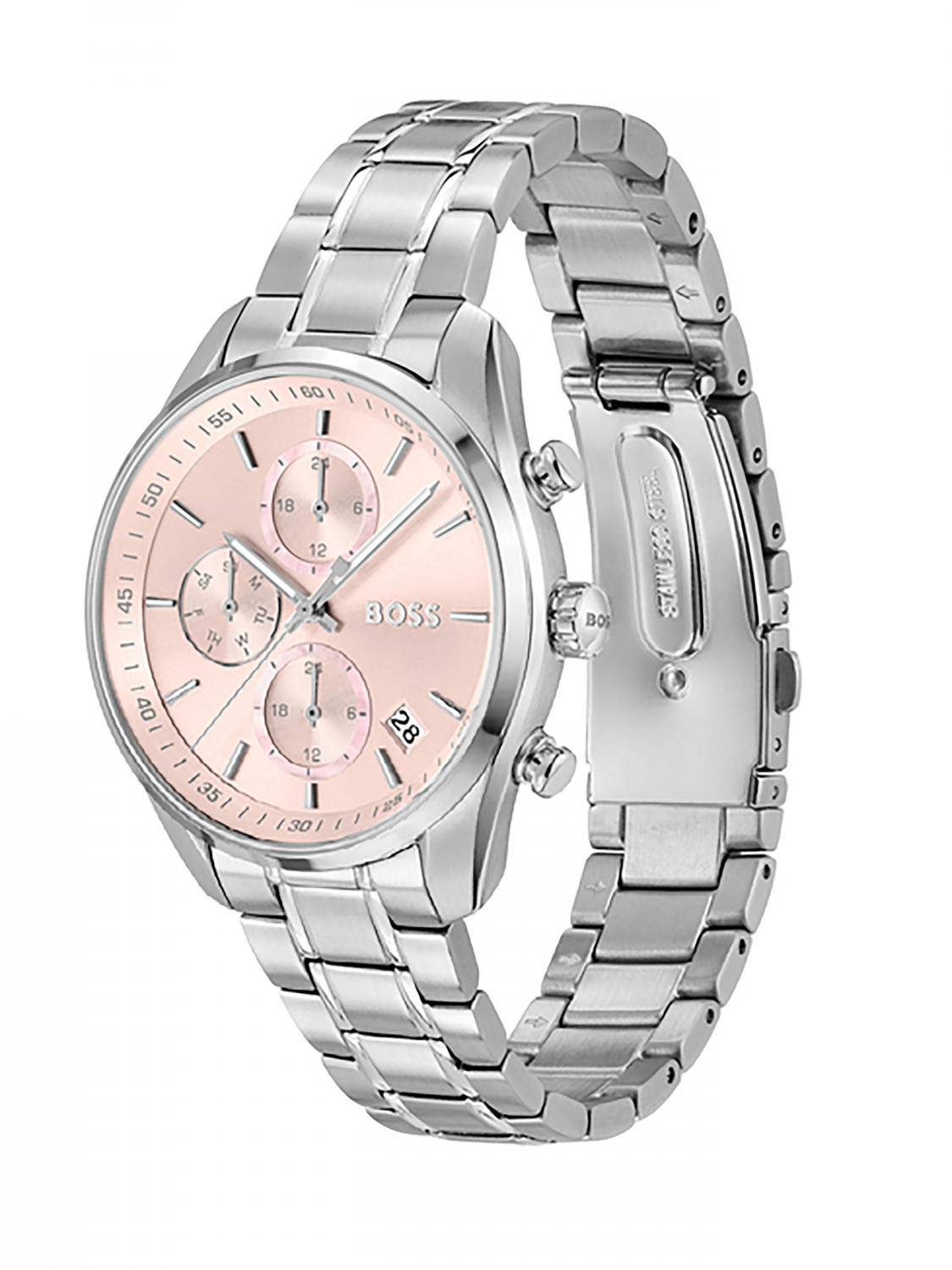 Часы Boss — это элегантная модель хронографа со светло-розовым циферблатом, на котором размещены три дополнительных циферблата и указатель даты между 4 и 5 часами. Серебристые индексы и стрелки придают часам изысканный вид. Корпус из полированной нержавеющей стали диаметром 38 мм идеально обрамляет циферблат. Браслет из нержавеющей стали с раскладывающейся застежкой обеспечивает надежную фиксацию на запястье. Эти часы защищены от брызг, но не подходят для плавания. Часы приводит в движение точный кварцевый механизм, который обеспечивает надежный хронометраж.