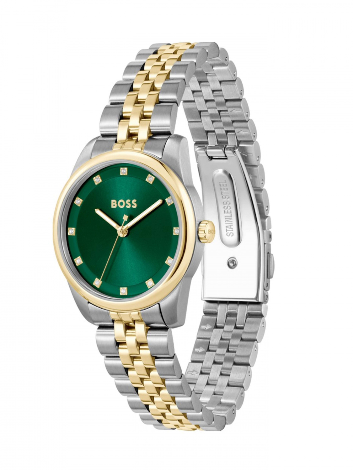Зеленый циферблат украшет кристаллами и защищен минеральным стеклом устойчивым к появлению царапин.