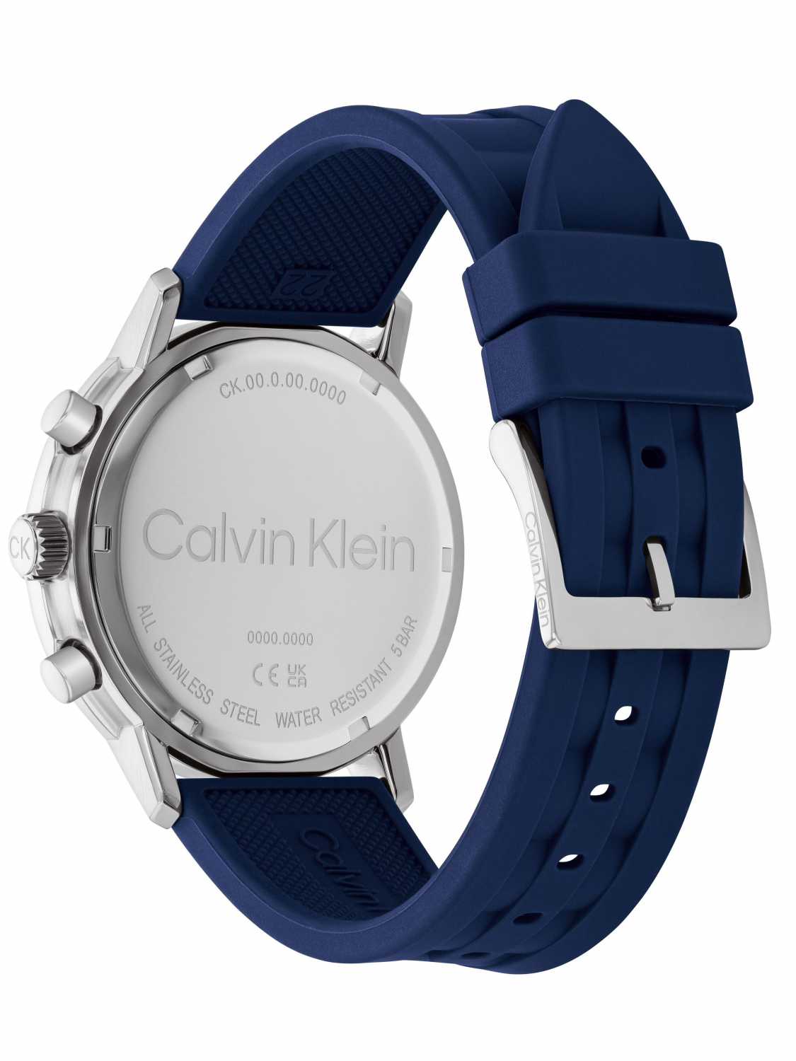 Часы Calvin Klein Gauge 25200460 — это мужская кварцевая мультифункциональная модель, сочетающая спортивный стиль и фирменный минимализм бренда. Темно-синий круглый циферблат с серебристыми стрелками и метками, защищён минеральным стеклом. На нём отображены даты, дня недели и 24-часового формата времени на трех дополнительных субциферблатах. Корпус изготовлен из нержавеющей стали. Диаметр составляет 44 мм.. Синий силиконовый ремешок с классической застежкой-пряжкой, устойчивый к влаге и удобный для повседневной носки. Водонепроницаемость 5 АТМ, выдерживают случайные брызги и дождь, но не предназначены для плавания.