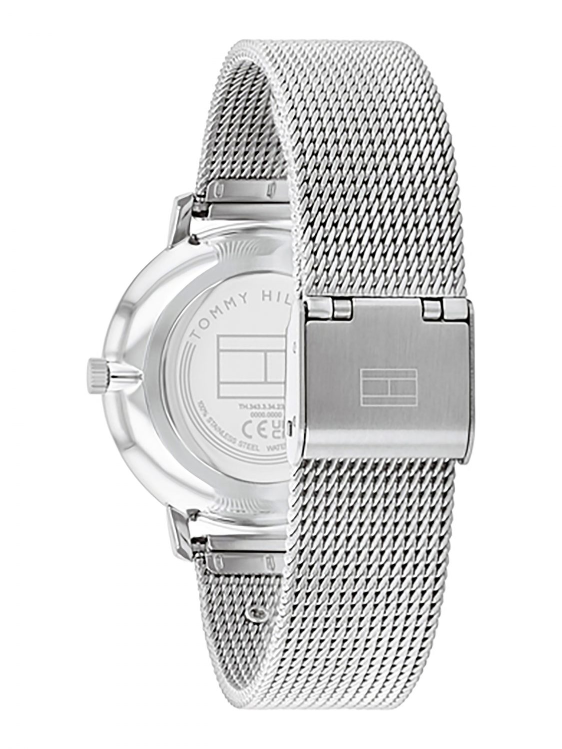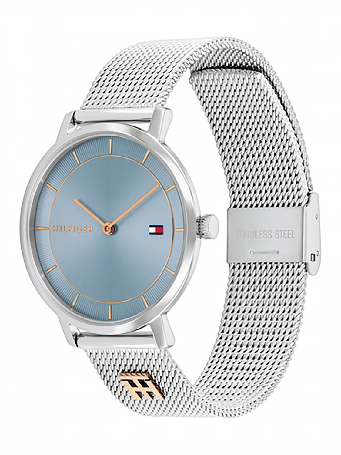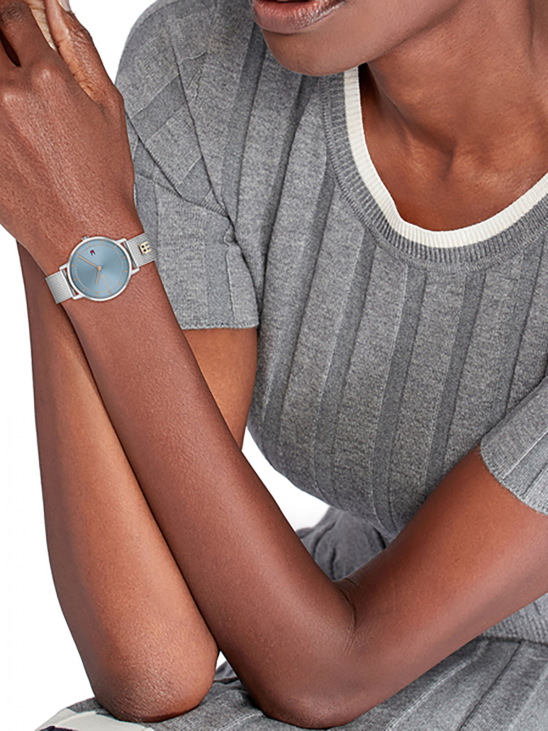 Женские кварцевые часы на стальном браслете миланского плетения. Часы с круглым корпусом. Минеральное стекло. Циферблат с метками в виде штрихов. Рифленая заводная головка.