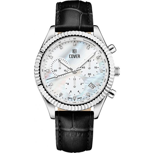 COVER CO207.05 — это женские швейцарские часы-хронограф из коллекции Valentina, сочетающие в себе элегантность и спортивный стиль. Кварцевый механизм. Циферблат белый натуральный перламутр, в качестве часовых индексов используются 12 кристаллов Swarovski. Диаметр составляет 38 мм.. Корпус изготовлен из нержавеющей стали 316L с полированной отделкой и рифленым безелем. Устойчивое к царапинам сапфировое стекло. Черный ремешок из натуральной кожи с классической застежкой-пряжкой.