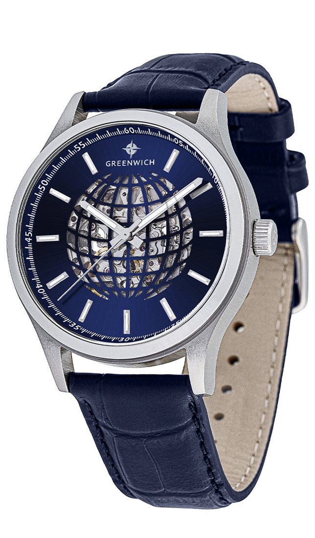 Часы-скелетон - это само по себе произведение часового искусства. А в серии Globe прозрачный циферблат украшает оригинальный элемент, линии параллелей и меридианов которого складываются в очертания глобуса. Задняя крышка модели тоже прозрачная, сквозь нее можно наблюдать за движениями ротора с традиционной уже для бренда гравировкой Good Luck и других деталей автоматического механизма Miyota. На пластине синего цвета закреплены накладные риски. Часовая и минутная стрелки выделены люминесцентным покрытием, которое обладает способностью светиться в темноте. Водостойкость часов Globe равна 10 атмосферам. Корпус модели сделан из нержавеющей стали, ремешок — из натуральной кожи синего цвета. Стальная застежка и удобная заводная головка декорированы логотипом бренда Greenwich.