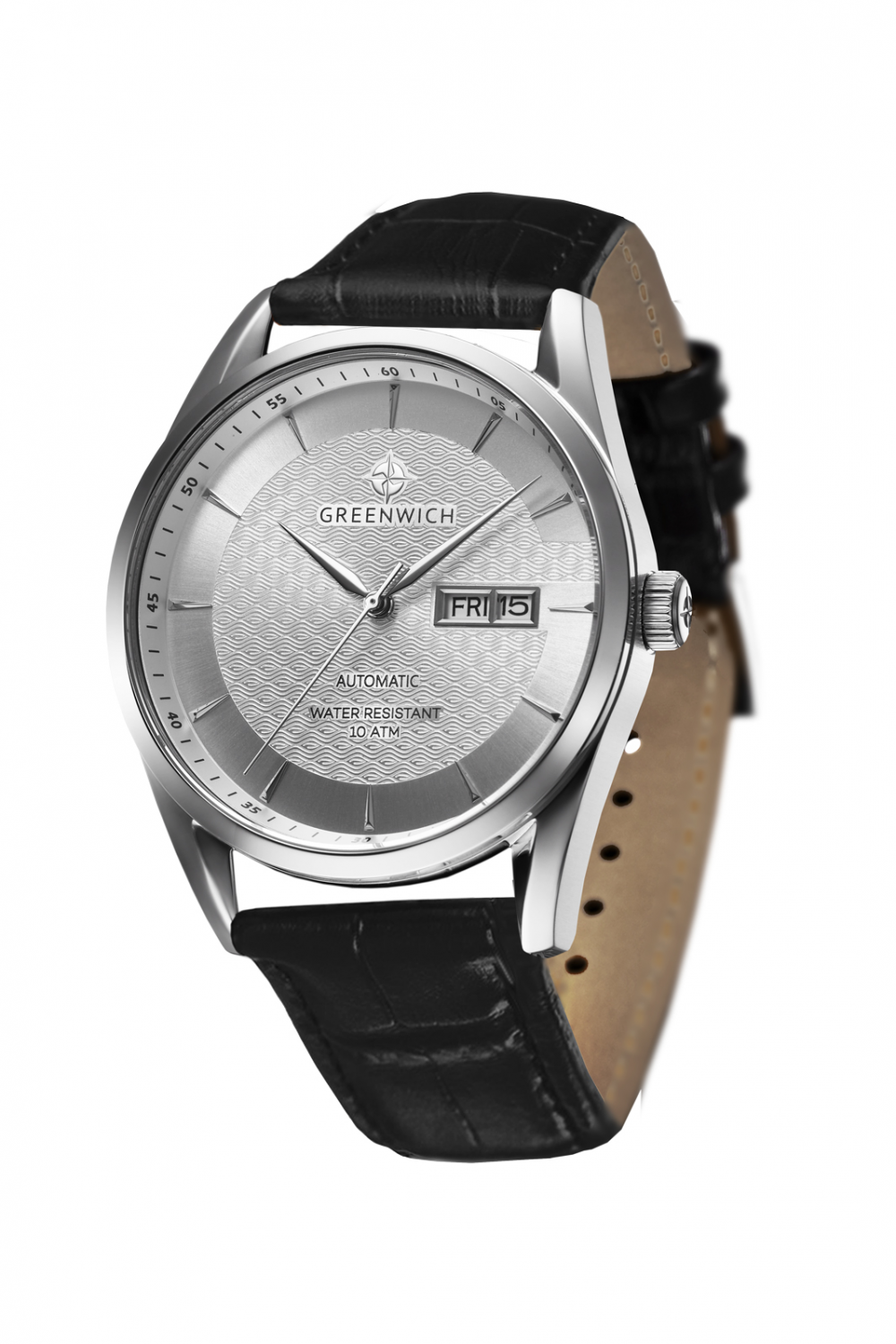 Корпус модели, диаметром 42 мм, состоит из трех частей. Он сделан из нержавеющей стали c двумя видами полировки: зеркальной по безелю и матированием. Задняя крышка прозрачная: вы можете любоваться автоматическим механизмом TMI, на роторе которого выгравирован силуэт парусника, символа английских мореходов. На фоне белого циферблата с рисунком гильоше, напоминающем волны, расположились три центральные стрелки и хорошо читаемое окошко даты и дня недели, выделенное стальной рамкой. Накладные риски закреплены на пластине в форме латинской буквы G, первой буквы в названии бренда.
