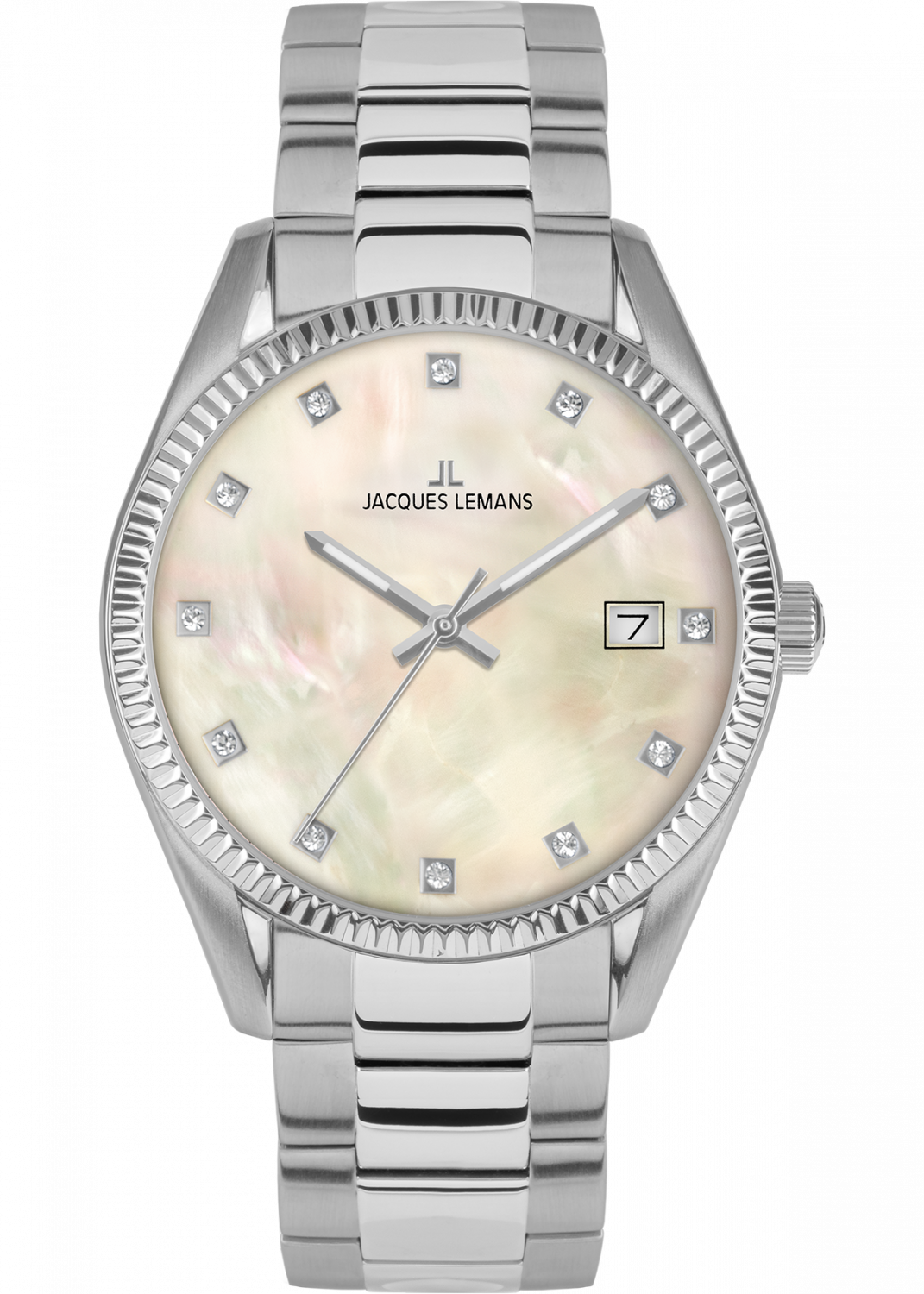 Женские наручные кварцевые часы. Коллекция Derby. Круглый стальной корпус. Рифленый полированный безель. Перламутровый циферблат с метками в виде точек кристаллов Swarovski. Стальной браслет с раскладывающейся застежкой. Водозащита 10 АТМ/bar.