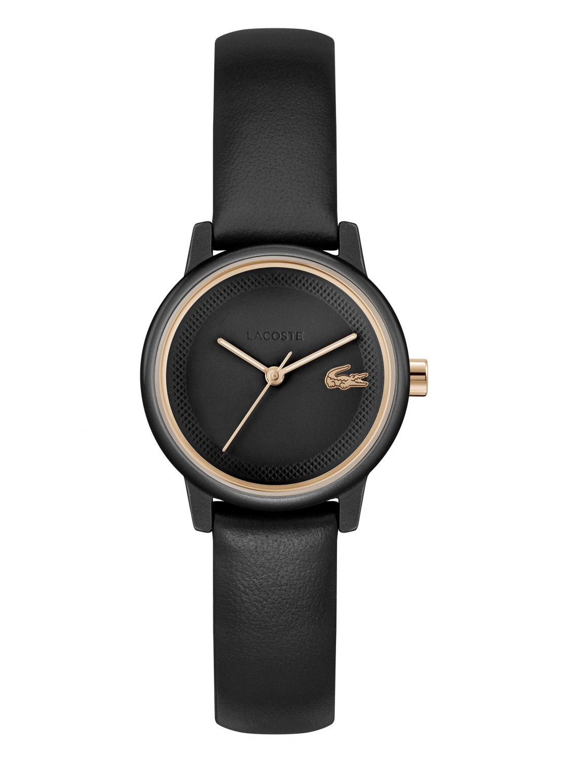 Черный циферблат с логотипом бренда защищен минеральным стеклом.