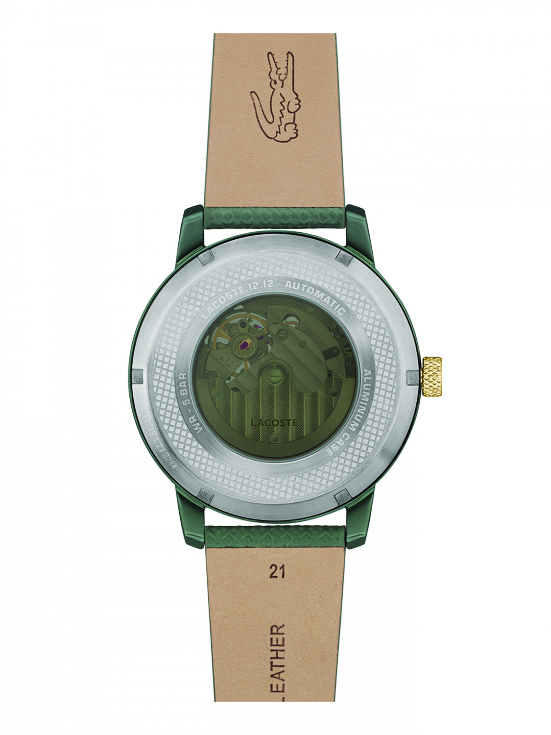 Круглый алюминевый корпус с IP покрытием. Циферблат с логотипом бренда защищен минеральным стеклом устойчивым к появлени. царапин. Циферблат: Зеленого цвета с вырезом в форме фирменного крокодила, через который видна работа механизма. Задняя крышка также прозрачная.