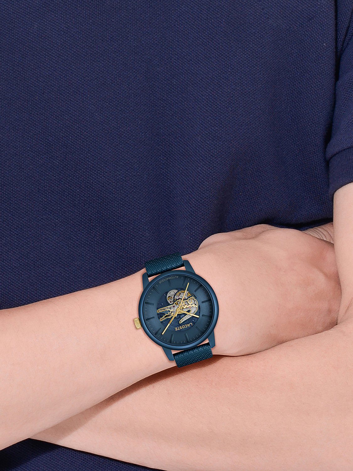Круглый алюминевый корпус с IP покрытием. Минеральное стекло устойчивое к появлению царапин. Синий циферблат типа «open heart» с отверстием в форме крокодила, через которое видна работа механизма.