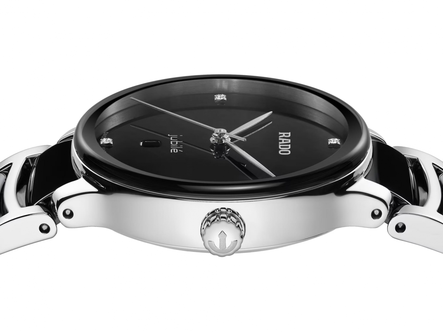 Циферблат черный украшен 4 бриллиантами (0.012 карата) в качестве часовых меток и логотипом «jubilé».