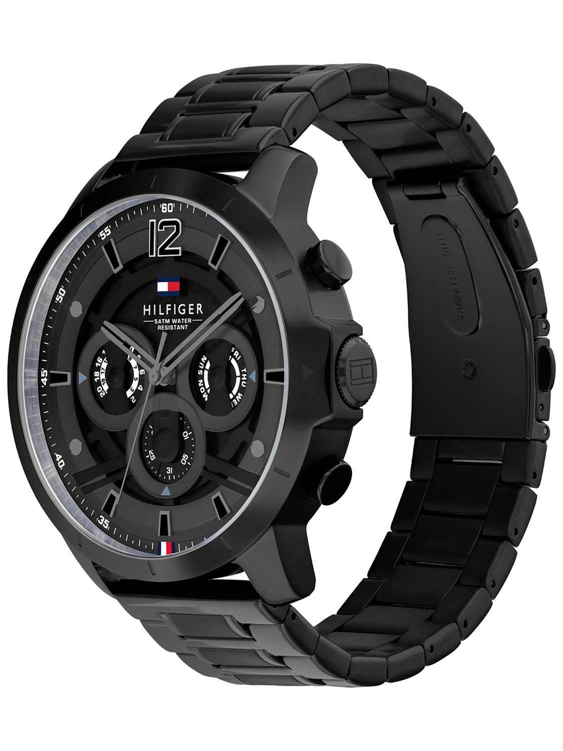 Мужские кварцевые часы из коллекции Luca.Круглый стальной корпус.12-ти и 24-х часовой формат времени. Дата и день недели вынесены на отдельные циферблаты. Циферблат с метками в виде штрихов,точек и арабской цифры 12.Корпус и браслет выполнены из стали с PVD покрытием. Браслет с традиционной застежкой.Водозащита 5 АТМ/bar.