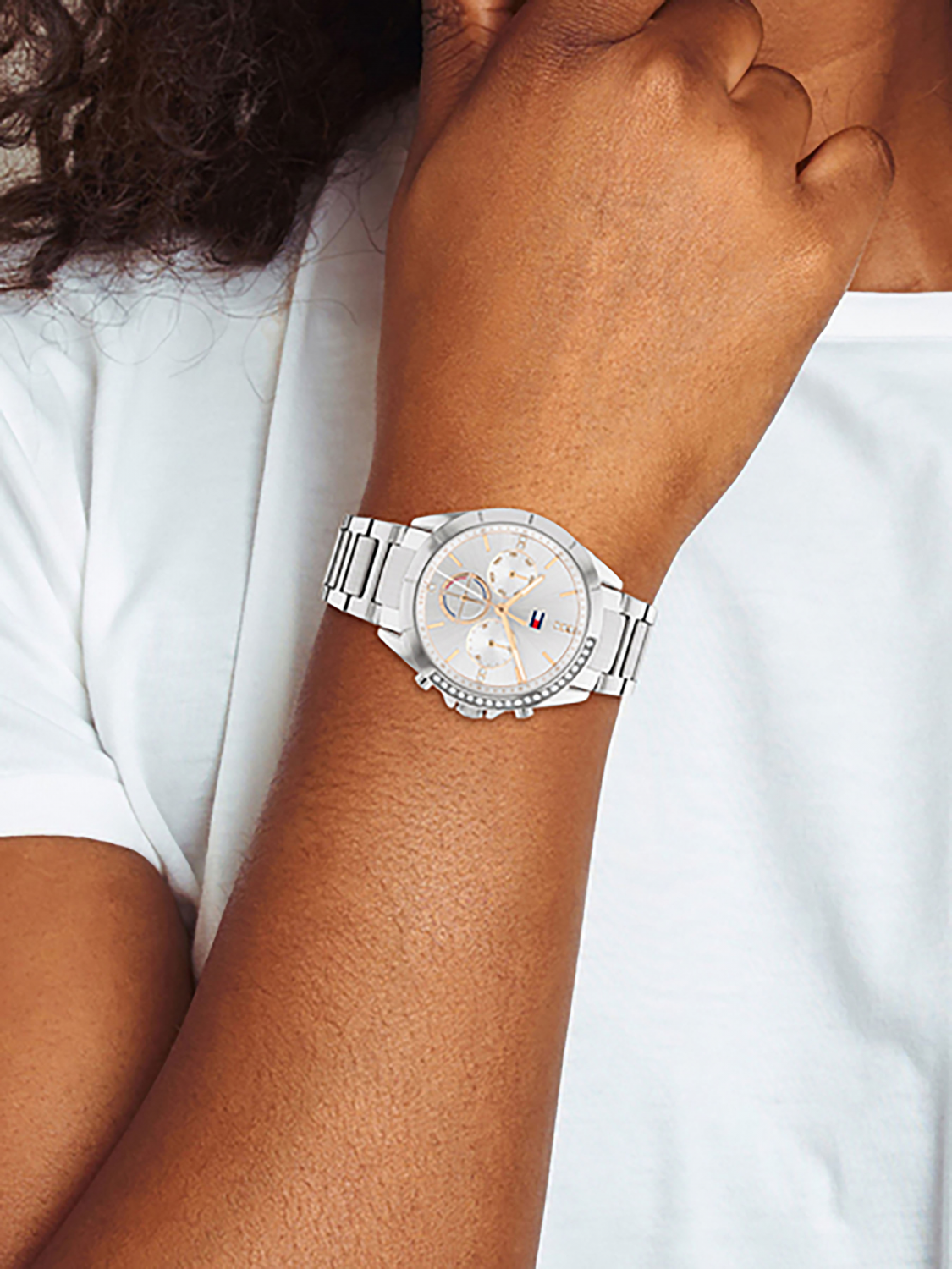 Женские кварцевые часы из коллекции Kennedy. Круглый стальной корпус. Циферблат с метками в виде штрихов. 12-ти и 24-х часовой формат времени. Дата и день недели вынесены на отдельные циферблаты. Минеральное стекло.Браслет с раскладной застежкой.Водозащита 5 АТМ/bar.