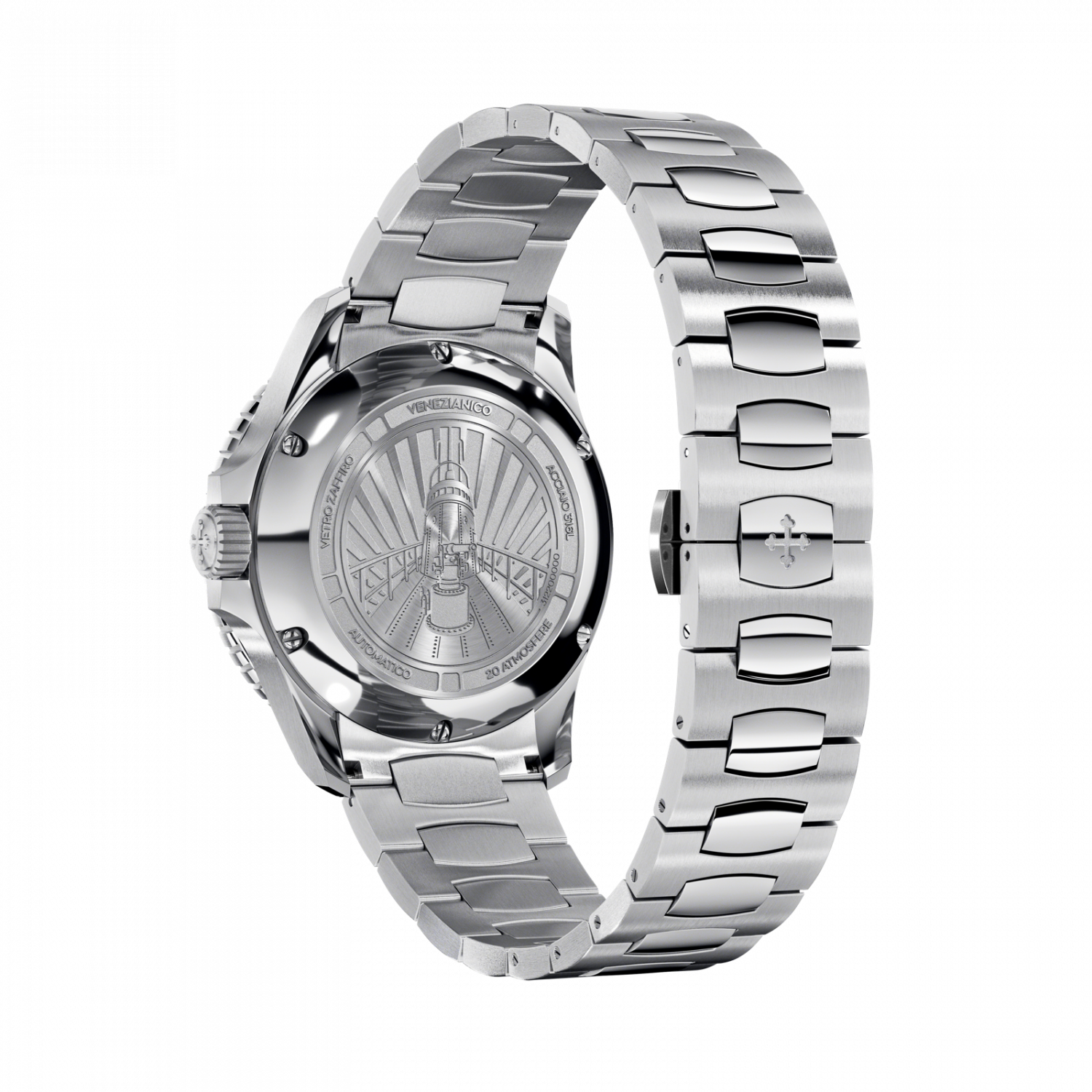 Сочетание спортивных и элегантных ноток способно покорить даже самую искушенную девушку. Nereide 39. Женские часы. Вдохновением на создание коллекции послужила подводная лодка итальянского королевского флота Nereide, которая была построена в 1913 году на военно-морской верфи Венеции. В механизме 24 камня, частота 21600 полуколебаний в час. Запас хода 41 час. Возможность ручного завода. Циферблат с метками в виде штрихов выполнен по технологии Sunray (солнечные лучи). Окошко даты находится в положении 3 часа. Безель со стеклянной вставкой BK7 вращается на 120 щелчков в одном направлении. Задняя крышка крепится на 6-ти винтах и украшена выгравированным изображением подводной лодки Nereide. Индивидуальный серийный номер. Завинчивающаяся заводная головка с защитой. Браслет Canova с раскладывающейся застежкой. Для изготовления данного браслета требуется 16 различных форм.