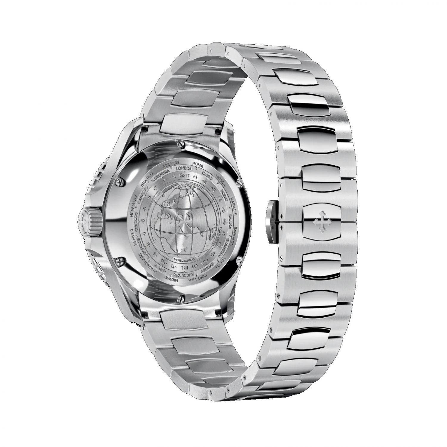 Удобный мужской аксессуар с надежным автоматическим механизмом не позволит упустить ни одной важной минуты вашего времени. Nereide GMT. Мужские дайверские часы с круглым корпусом. Часы вдохновлены одним из последних чудес венецианской военно-морской техники — подводной лодки Nereide. Вращающийся безель. Функция GMT. В механизме 24 камня, частота 21600 полуколебаний в час. Запас хода 41 час. Возможность ручного завода. Циферблат с метками в виде штрихов выполнен по технологии Sunray (солнечные лучи). Окошко даты в положении 3 часа. Задняя крышка крепится на 6-ти винтах и украшена выгравированным изображением глобуса. Индивидуальный серийный номер. Рифленая заводная головка с защитой. Браслет Canova с раскладывающейся застежкой. Для изготовления данного браслета требуется 16 различных форм.